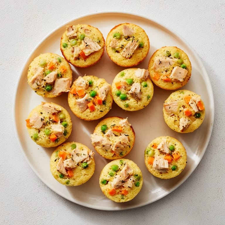 Save Miniature, savory muffins combining the comfort of chicken pot pie with the sweetness of cornbread—perfect as party snacks or a cozy dinner treat.