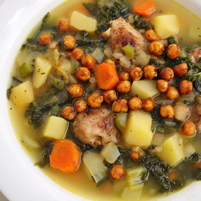 Save A nourishing and flavorful soup featuring tender chicken, hearty kale, and crunchy roasted chickpeas for a healthy twist on classic comfort food. Perfect for chilly nights, this bowl brims with vibrant vegetables and satisfying protein.