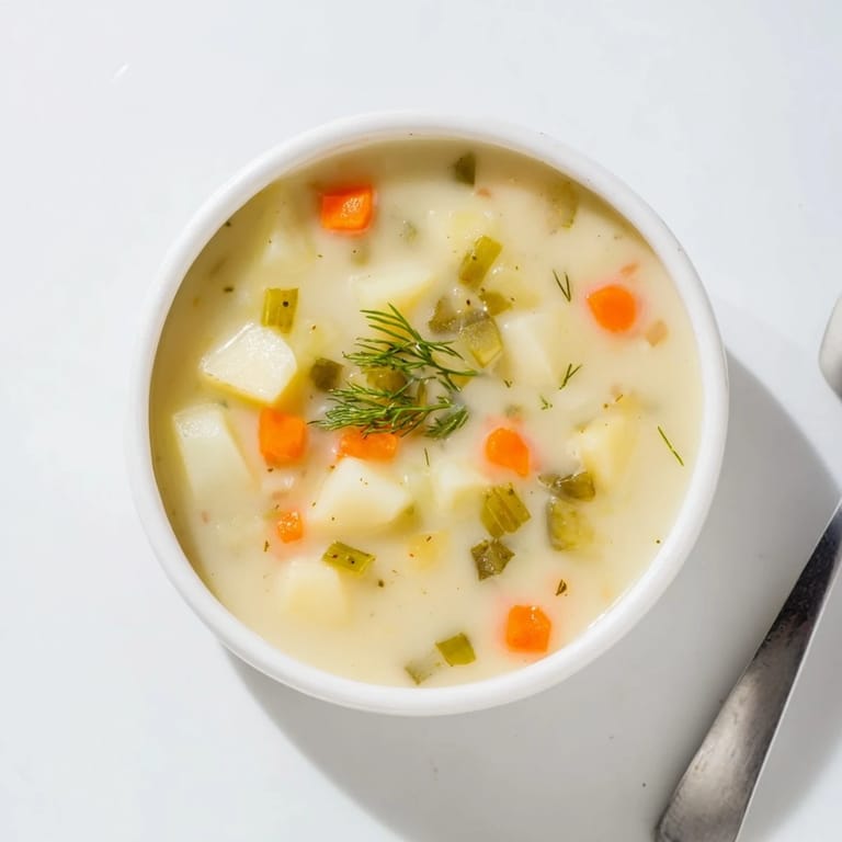 Save A tangy, creamy potato soup brightened by dill pickles—this unexpected winter warmer is rich, satisfying, and bursting with flavor.