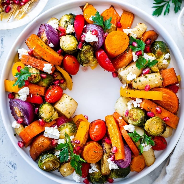 Save A vibrant, eye-catching centerpiece made from roasted winter vegetables, arranged in a festive wreath shape. Perfect for holiday gatherings, this dish combines seasonal flavors with a stunning presentation.