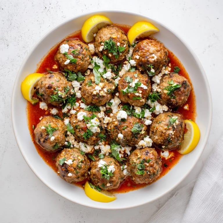 Save Juicy, herbed meatballs simmered in a savory tomato base, topped with a creamy lemon-feta sauce—an easy weeknight dinner bursting with Mediterranean flavor.