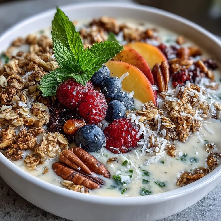 - Toppings: 1/2 cup granola (gluten-free if needed), 1/4 cup fresh mixed berries (e.g., blueberries, strawberries, raspberries), 2 tablespoons unsweetened coconut flakes, 1 tablespoon chia seeds (optional), fresh mint leaves (optional, for garnish)