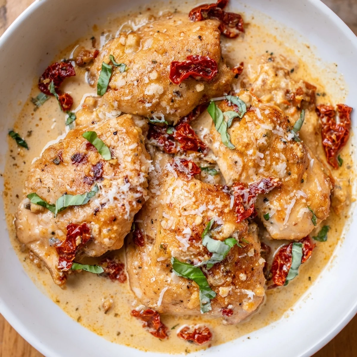 Save Tender, juicy chicken thighs simmered in a creamy sun-dried tomato sauce with garlic and Parmesan, perfect for a quick and romantic weeknight dinner.