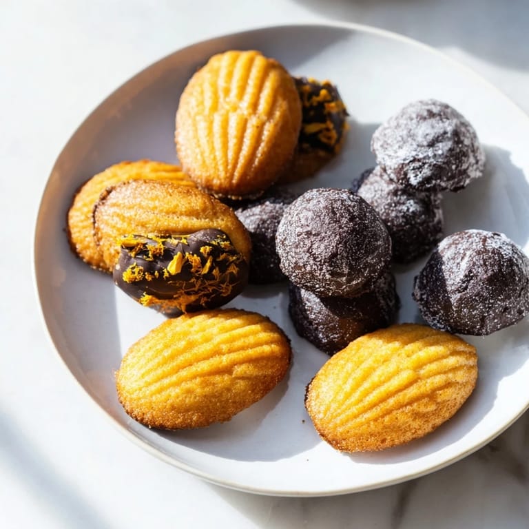 - Arrange financiers madeleines and truffles on a festive platter. Dust with powdered sugar and garnish with candied orange peel or pistachios if desired.