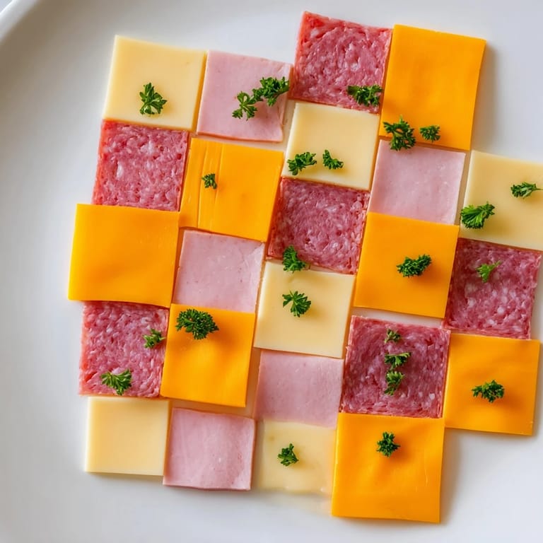 - Use a sharp knife on a clean board to cut meats and cheeses into uniform 2-inch squares, working methodically so each piece is roughly the same size. This uniformity is what makes the patchwork pattern actually read as intentional rather than random.
