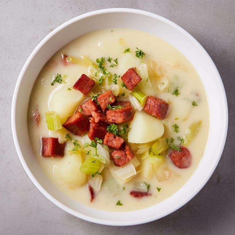 Save A hearty and flavorful soup combining creamy potatoes, tender leeks, and spicy chorizo for a comforting meal perfect for cool days.