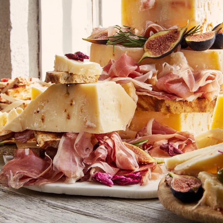 The three cheeses here were chosen to offer textural and flavor contrast: hard and crystalline, semi-soft and fruity, soft and creamy. But this isn't dogma. If Taleggio isn't available, Robiola or even fresh burrata works beautifully. Swap the Pecorino for Asiago if that's what you find. The principle that matters is balance—include at least one hard aged cheese for depth, one soft cheese for texture contrast, and one medium cheese that bridges them. Visit a good cheese counter and ask the person working there what's at its peak right now. They'll often have recommendations that will make your board distinctly yours.