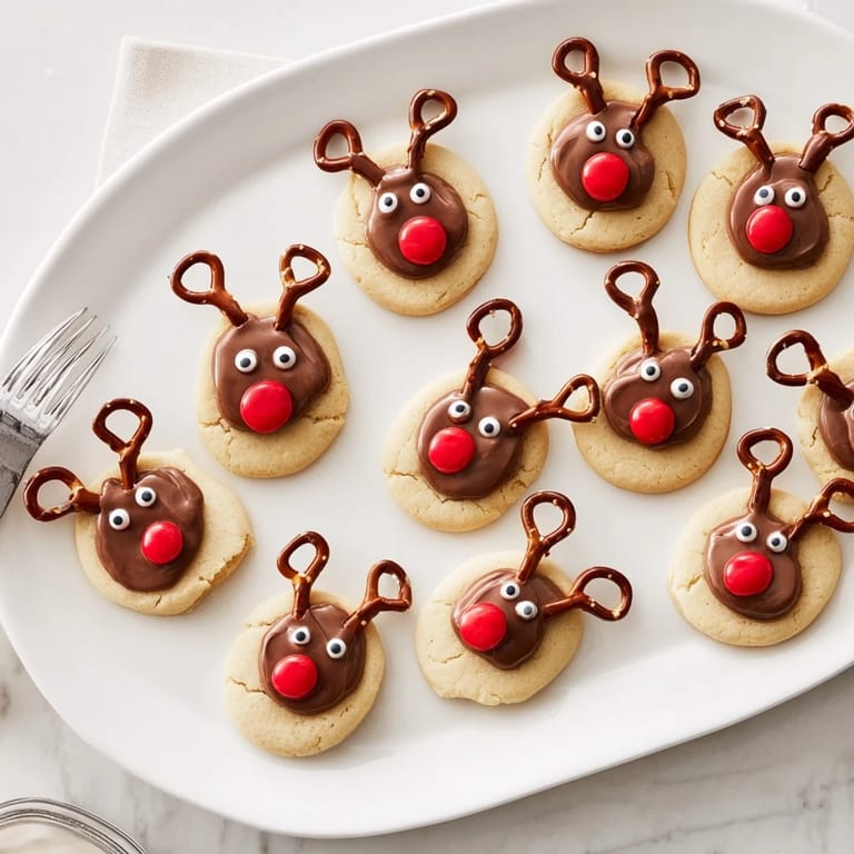 Spread brown-tinted icing for the face, use red candy for the nose, black candy for the eyes, and attach mini pretzels as antlers with icing. Optional sprinkles or edible glitter add festive sparkle.