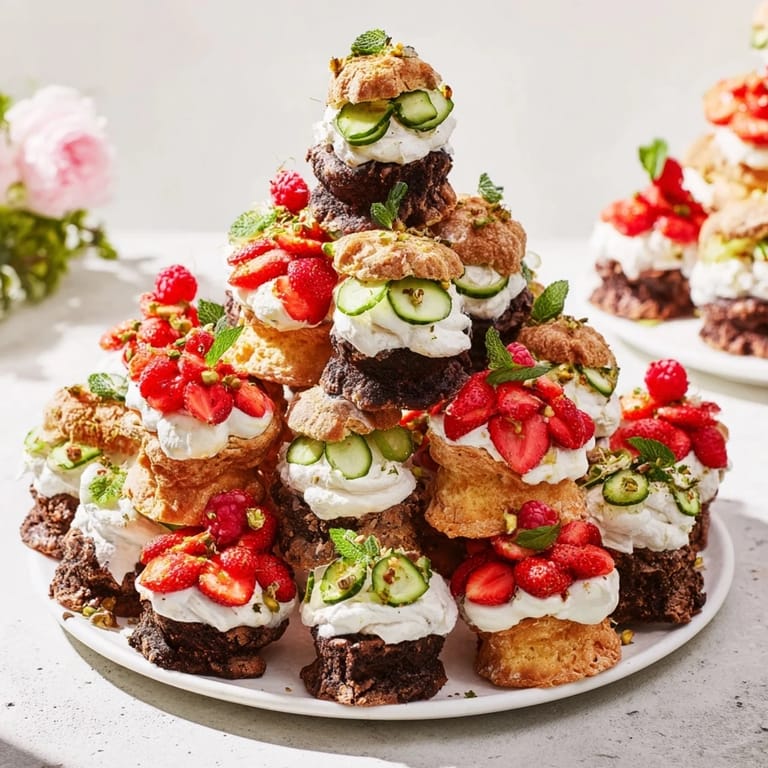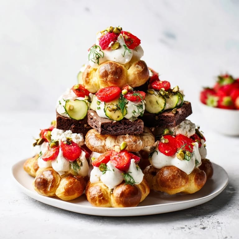 Alternate savory and sweet layers starting with a gougère base, then stacking brownies and madeleines topped with fresh fruits and creamy spreads for a visually appealing tower.